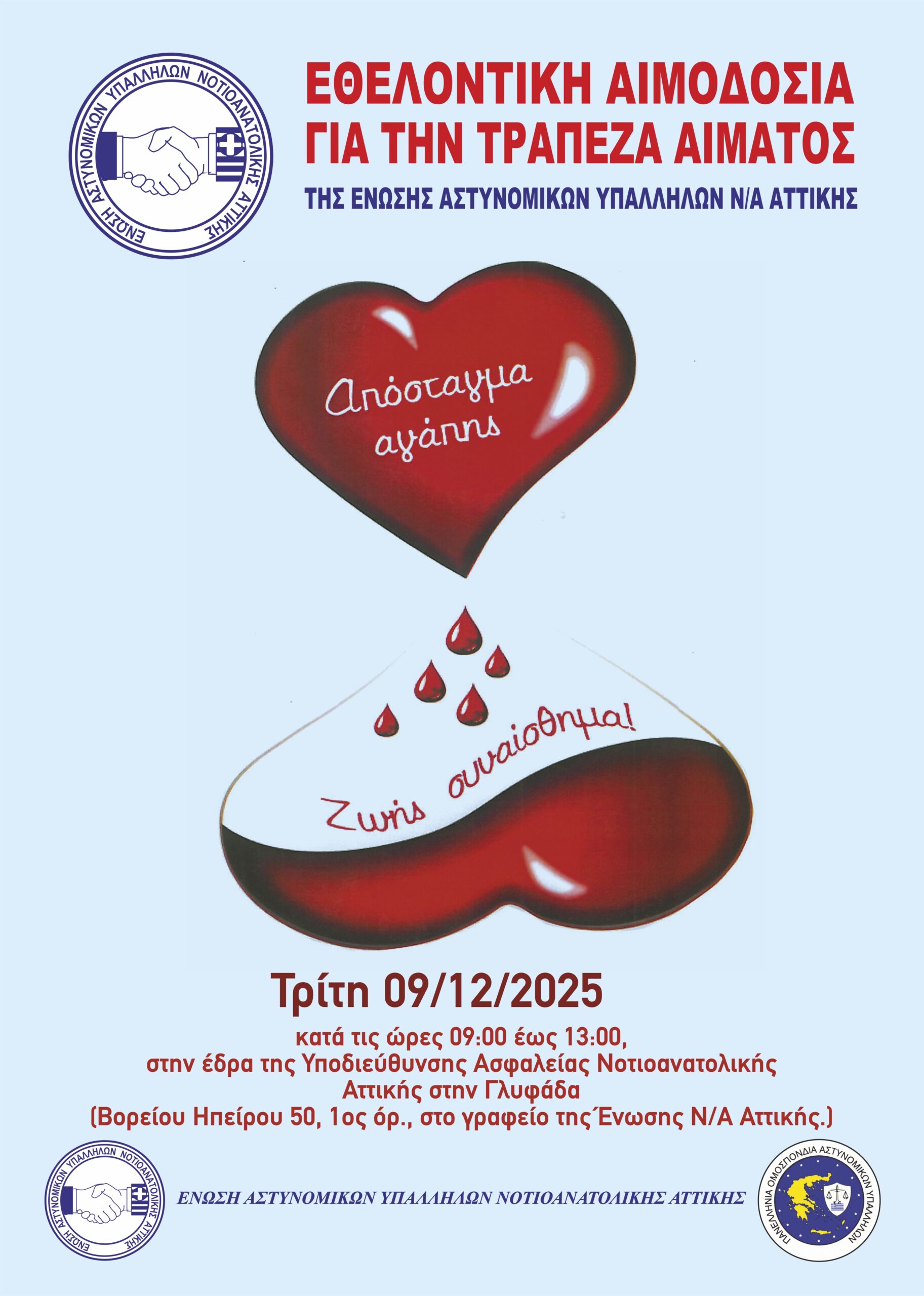 Σας περιμένουμε να δώσουμε όλοι μαζί λίγο από το χρόνο μας την Τρίτη 09/12/2025, κατά τις ώρες 09:00΄ έως 13:00΄, στην έδρα της Υποδιεύθυνσης Ασφαλείας Νοτιοανατολικής Αττικής στη Γλυφάδα (οδ. Βορείου Ηπείρου αρ. 50, 1ος όροφος, στο γραφείο της Ένωσης Ν/Α Αττικής).