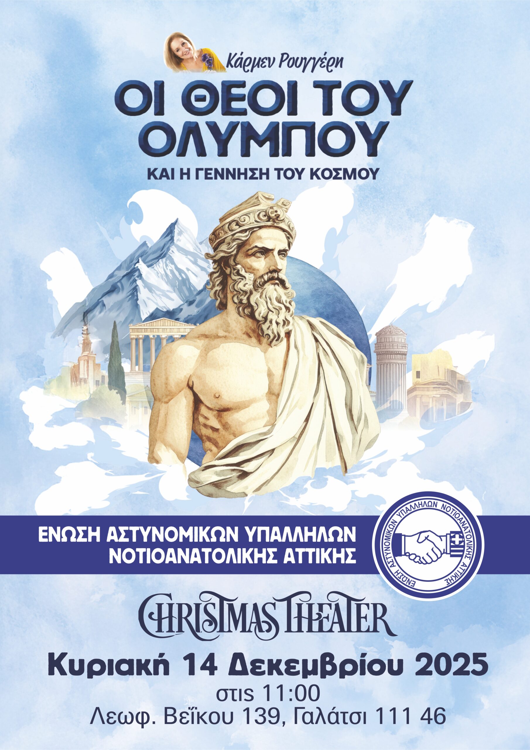 Είμαστε στην ευχάριστη θέση να σας προσκαλέσουμε στη θεατρική παράσταση: «ΟΙ ΘΕΟΙ ΤΟΥ ΟΛΥΜΠΟΥ ΚΑΙ Η ΓΕΝΝΗΣΗ ΤΟΥ ΚΟΣΜΟΥ» της παιδικής σκηνής της Κάρμεν Ρουγγέρη, που θα πραγματοποιηθεί την Κυριακή 14/12/2025 και ώρα 11:00, στο CHRISTMAS THEATER, Λεωφ. Βεΐκου 139, Γαλάτσι 111 46, με δωρεάν είσοδο.