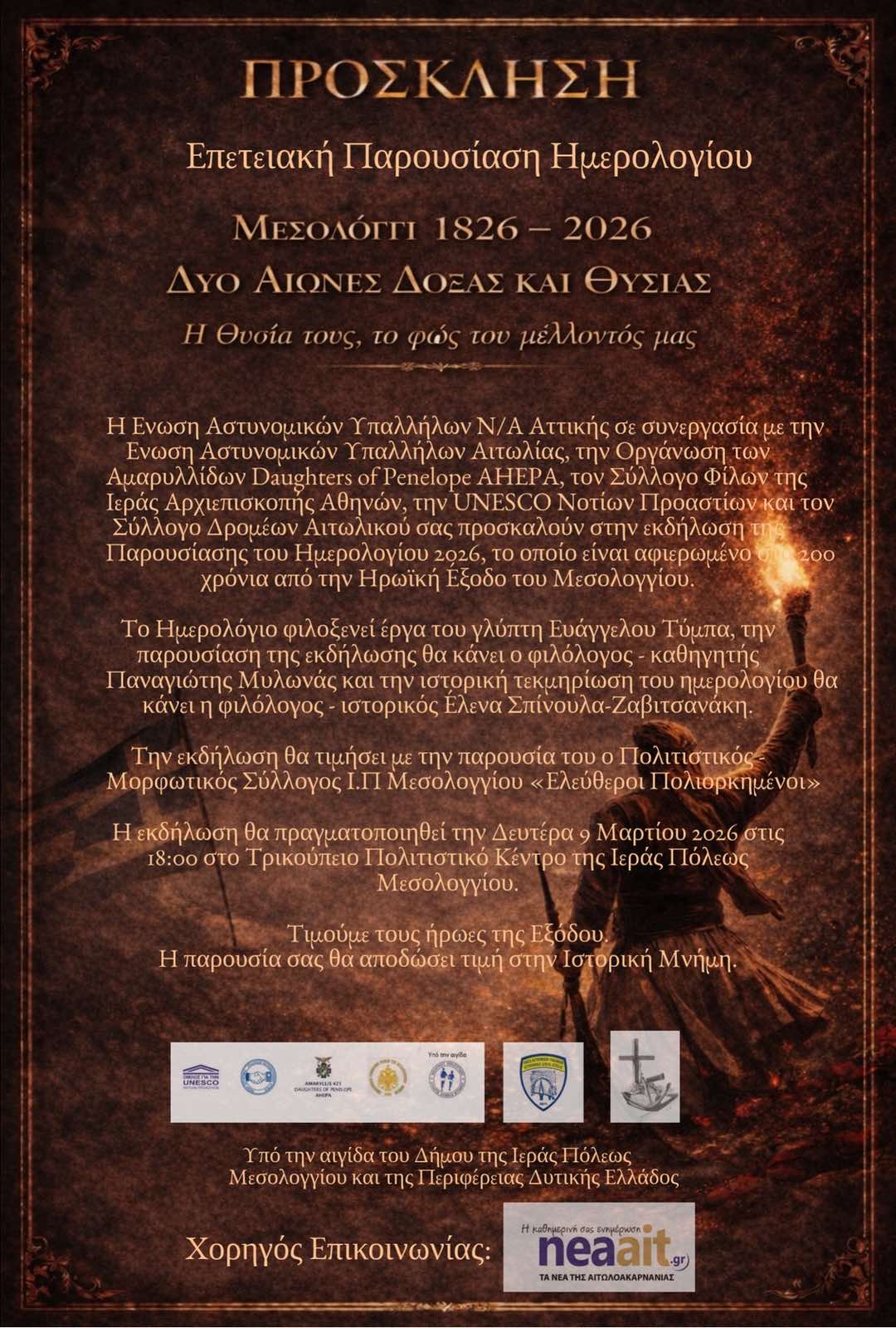 Η Ένωση Αστυνομικών Υπαλλήλων Νοτιοανατολικής Αττικής, σε συνεργασία με την Ένωση Αστυνομικών Υπαλλήλων Αιτωλίας ανακοινώνει την επίσημη παρουσίαση του Ημερολογίου για το έτος 2026 με τίτλο: «ΜΕΣΟΛΟΓΓΙ 1826-2026 Δύο Αιώνες Δόξας και Θυσίας-η θυσία τους, το φως του μέλλοντός μας» με έργα του γλύπτη Ευάγγελου Τύμπα, η οποία θα πραγματοποιηθεί τη Δευτέρα 09 Μαρτίου 2026 και ώρα 18:00, στο Τρικούπειο Πολιτιστικό Κέντρο, στην Ιερά Πόλη Μεσολογγίου.