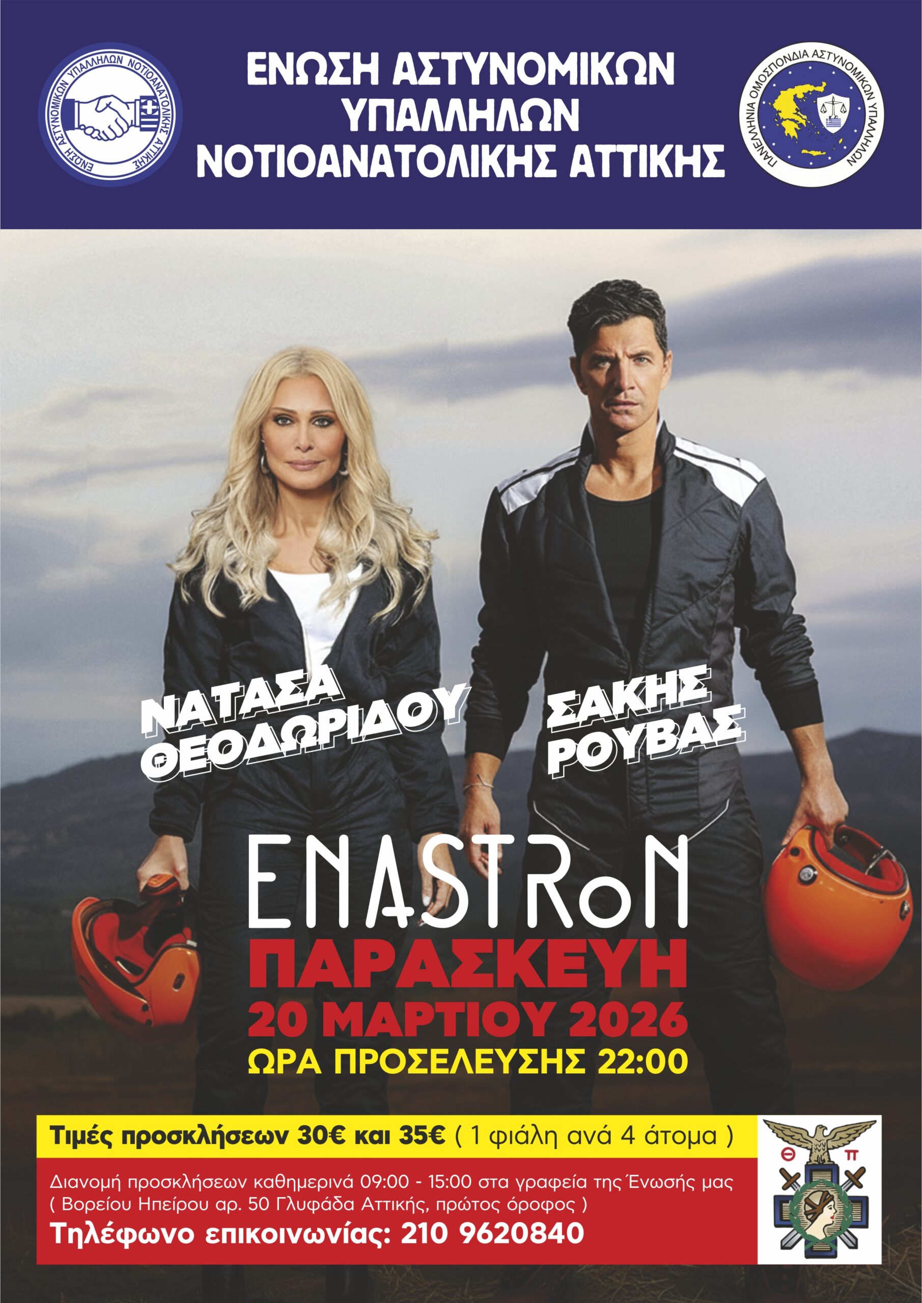 Η Ένωση Αστυνομικών Υπαλλήλων Νοτιοανατολικής Αττικής διοργανώνει τον ετήσιο χορό της την Παρασκευή 20 Μαρτίου 2026, στο κέντρο διασκέδασης «ΕΝΑΣΤΡΟΝ» (Λεωφόρος Πειραιώς 178, Ταύρος Αττικής).
